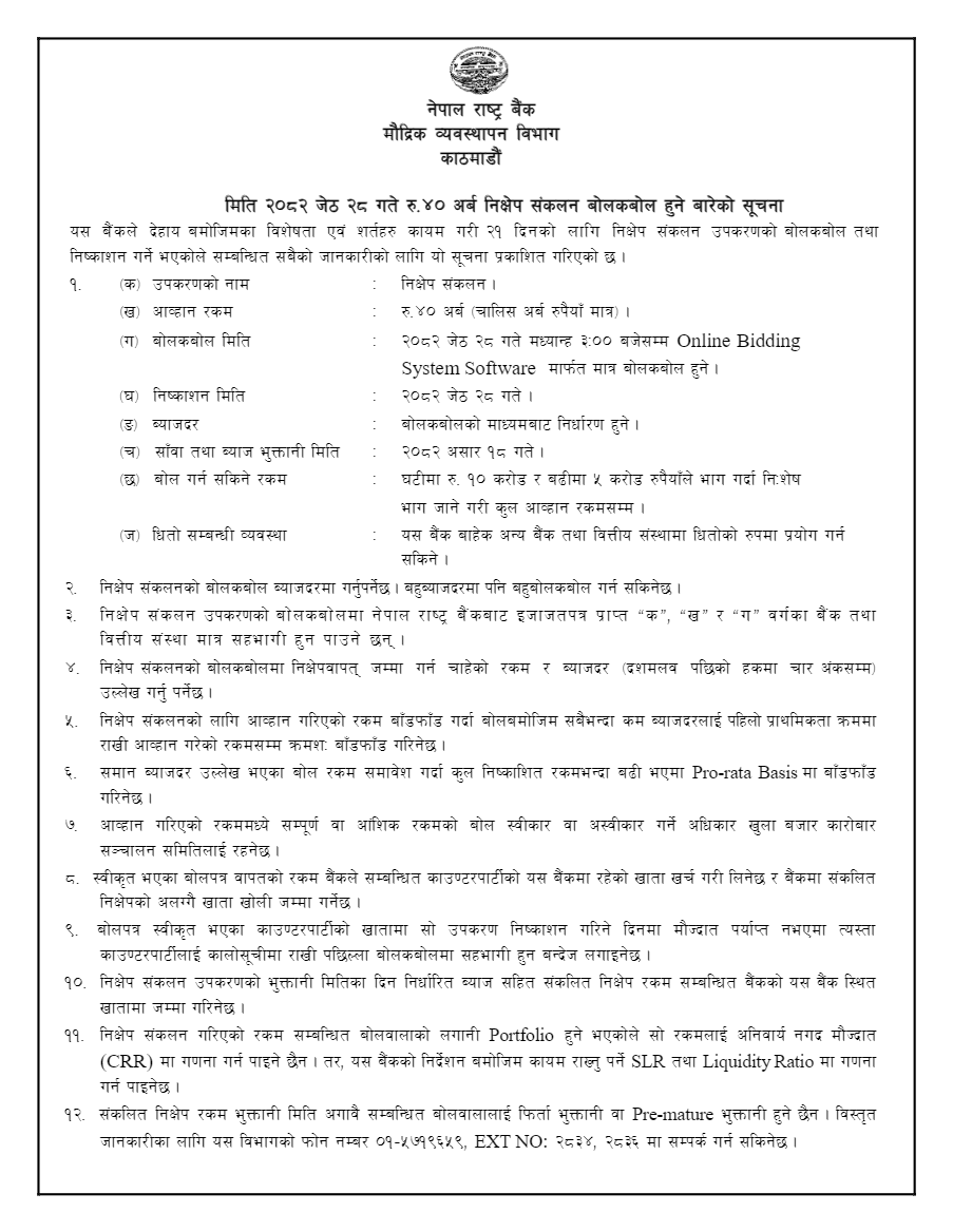 बहु ब्याजदरमा पनि बहु बोलकबोल गर्न सकिनेछ । निक्षेप सङ्कलन उपकरणको बोलकबोलमा राष्ट्र बैंकबाट इजाजत पत्र प्राप्त ‘क’, ‘ख’ र ‘ग’ वर्गका बैंक तथा वित्तीय संस्था मात्र सहभागी हुन पाउनेछन् ।